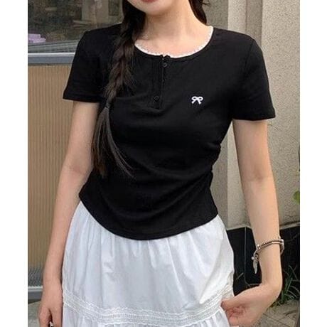 リボン刺しゅうがアクセントになった、レースネックのヘンリーネック半袖Tシャツ。