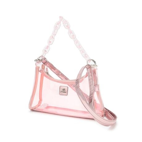 スタイリングに涼やかなアクセントを添えるクリアタイプのショルダーバッグです。光沢感のある生地とメタルロゴでクールな印象に仕上げました。チェーンとベルトの2つがついており、用途やコーデに合わせて使い分けも可能。シンプルなデザインなので、キーホルダーや中に入れる荷物でアレンジするのがおすすめです。≪重さ≫F/約240g
