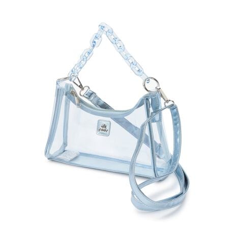 スタイリングに涼やかなアクセントを添えるクリアタイプのショルダーバッグです。光沢感のある生地とメタルロゴでクールな印象に仕上げました。チェーンとベルトの2つがついており、用途やコーデに合わせて使い分けも可能。シンプルなデザインなので、キーホルダーや中に入れる荷物でアレンジするのがおすすめです。≪重さ≫F/約240g