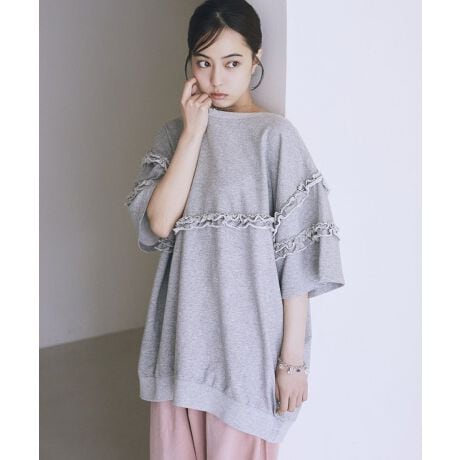 さりげないフリルで叶える大人の可愛さやわらかなミニ裏毛素材を使用した、着心地の良いプルオーバーです。軽やかで肌あたりがやさしく、デイリーに取り入れやすいのが魅力です。フロントから袖にかけて施されたフリルデザインが、甘さを抑えた上品なアクセントとなり、大人らしい可愛らしさを演出します。ゆったりとしたシルエットでリラックス感がありながら、自然に体型カバーも叶えてくれるため安心して着用できます。パンツにもスカートにも合わせやすく、カジュアルからきれいめまで幅広いコーディネートに対応します。日常使いからお出かけまで活躍する、着回し力の高い一枚です。透け感[なし]