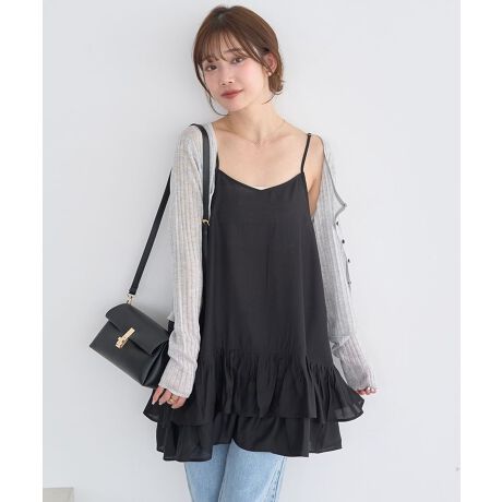 ふんわりとしたティアードとフリルの組み合わせが、やさしく可愛らしい印象を演出してくれるキャミソールです。シンプルなインナーにプラスするだけでコーディネートに奥行きが生まれ、いつものスタイルを新鮮に見せてくれます。軽やかな素材感で重ねてももたつきにくく、快適な着心地が続きます。肩ひもで長さを調整できるため、トップスとのバランスも取りやすいのがうれしいポイントです。パンツにもスカートにも合わせやすく、きれいめからカジュアルまで幅広く楽しめる着回し力の高い一着です。