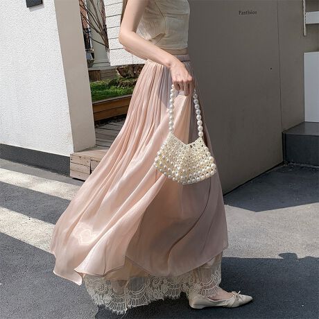裾にレースをあしらったデザインが華やかな印象を与えるロングスカート。