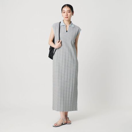 抜け感とフェミニンムードを両立する、ボーダー柄スキッパーワンピース。