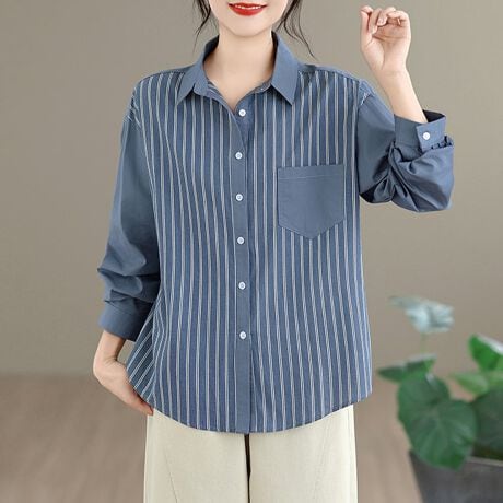 ストライプと無地を組み合わせた切替デザインが目を引く長袖シャツ。