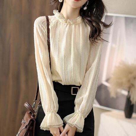 首元に細かなフリルをあしらった華やかなデザインが目を引く長袖ブラウス。