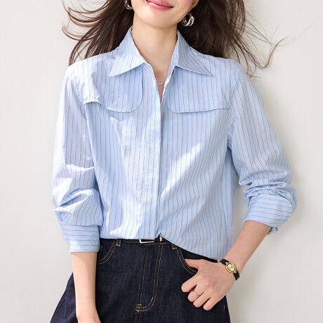 細いストライプ柄がすっきりとした印象を与える長袖シャツ。