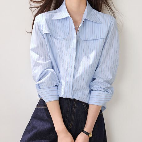 細いストライプ柄がすっきりとした印象を与える長袖シャツ。