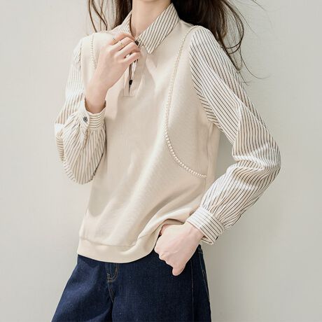 ストライプ切替×シャツ風デザイントップス