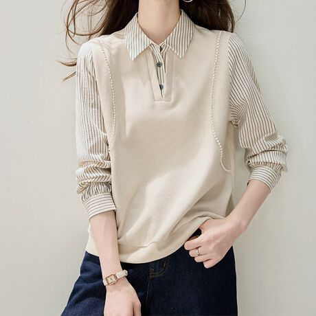 ストライプ切替×シャツ風デザイントップス