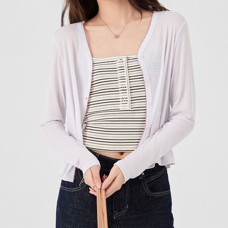 薄手で軽い着心地のため、季節の変わり目や冷房対策にも使いやすい一枚です。