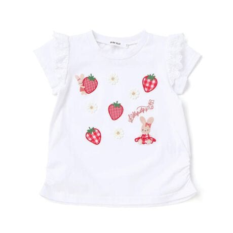 肩にあしらったレースフリルと、ウサギやイチゴ、お花のパッチがとびきり可愛い女の子用半袖Tシャツ。