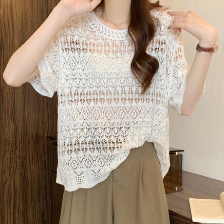 繊細な編み模様がコーデのアクセントになり、シンプルなボトムと合わせるだけで大人らしいスタイルが完成します。