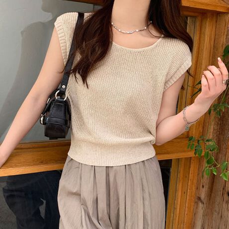 首元はシンプルなクルーネックで、顔まわりをすっきり見せるノースリーブニットトップス。