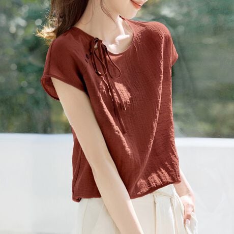 首元にリボンタイをあしらった上品な半袖ブラウスです。
