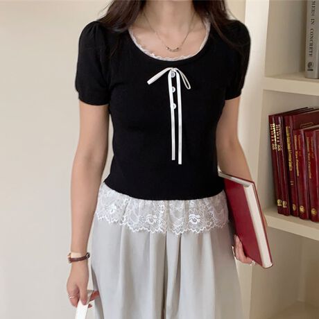 レースヘム×リボンタイニットトップス レディース トップス