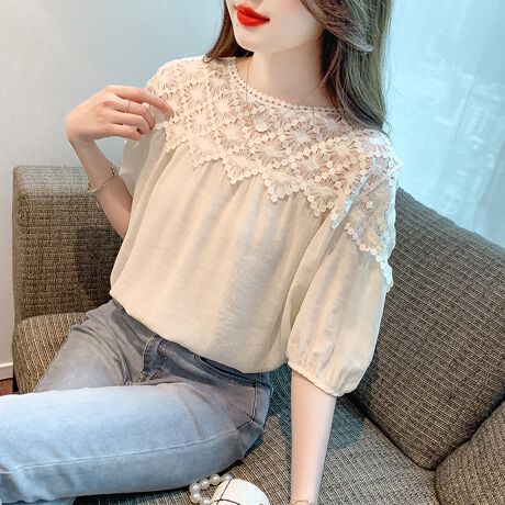 肩から胸元にかけてレースを切り替えた華やかな印象の半袖ブラウスです。