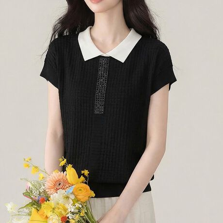 顔周りを上品に引き立てる配色襟が特徴的なトップスです。
