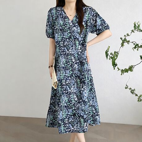 小花柄が広がるフレアシルエットのワンピースです。