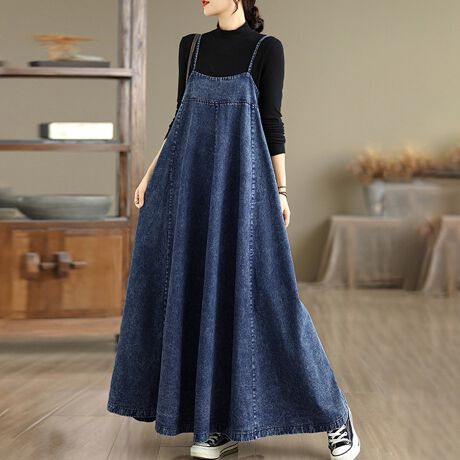 細いストラップが特徴のロング丈デニムワンピースです。