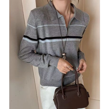 シンプルなボーダー配色が目を引く、襟付きデザインのニットポロシャツ。
