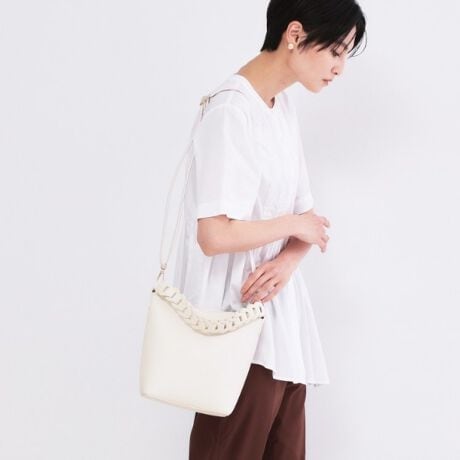 デニムやブラウスを合わせたカジュアルスタイルに、ショルダーとして斜め掛けし軽やかな印象に。