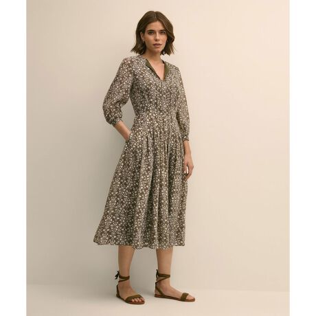 ガーゼのように軽やかな風合いと、ドレープ感のある生地が生み出す、流れるようなソフトプリーツが目を引く一着。リヨセル混紡素材ならではのなめらかな肌触りが、心地よい着用感をもたらします。オリーブを基調とした甘すぎない大人のフローラルプリント。ドラマチックな袖のボリュームと、繊細なボウタイディテールが、リラックスしたシルエットにアクセントを添えます。