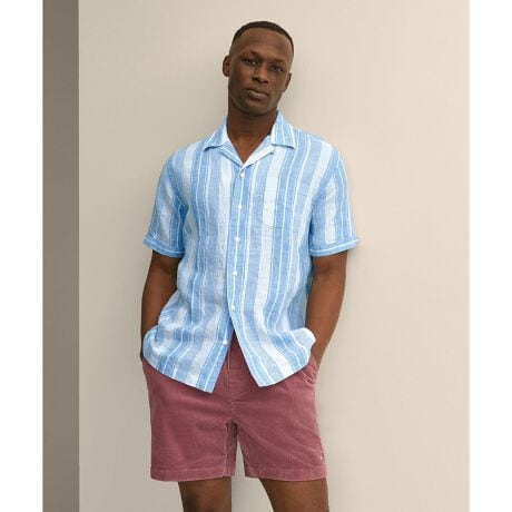 解放感のある、開いた襟元がリラックス感と華やかさを演出します。第一釦の位置が低く台襟の無いフラットな構造のため、前を開けても襟の収まりが良く、Tシャツやカットソーの上からラフに羽織るコーディネートにも最適です。リネン特有のネップやシワが織りなす豊かな風合いは、カジュアルなスタイリングでも大人の余裕と洗練された雰囲気を醸し出す魅力を持っています。