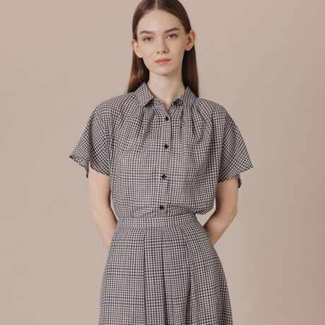 シャツカラーでキチンと感がありながら、衿ぐりのギャザーから広がるシルエットがリラックスしたムードのブラウスです。パンツ合わせや、同素材のスカート(品番:G5S11759)と合わせてワンピースの様にも着用いただけ、スタイリングの幅が広がるアイテムです。