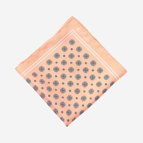 イタリア北部コモの産地で、18匁のシルク素材にメダリオン柄をモダンな配色でインクジェットの手法でプリントしたチーフです。手巻き縫製で丁寧に仕上げられたエレガントな製品です。メダリオン柄とは主にペルシャ絨毯に見られる様な、中心に大きな円形や菱形などの装飾模様があり、その周囲に花や幾何学模様が配置された柄です。宇宙的、神秘的な秩序を象徴しているとも言われています。