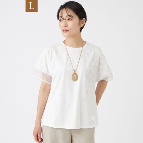 ジャージー素材とソフトオーガンジーを組み合わせた異素材コンビネーションTシャツ。袖は切り替え部分にオーガンジーを使用し、透け感とふんわりしたボリュームでちょうちんのようなシルエットをつくります。前身頃にはパンサーモチーフをさりげない配色でプリント。シンプルながら、スタイリングを印象的に仕上げてくれる一枚です。
