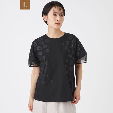 ジャージー素材とソフトオーガンジーを組み合わせた異素材コンビネーションTシャツ。袖は切り替え部分にオーガンジーを使用し、透け感とふんわりしたボリュームでちょうちんのようなシルエットをつくります。前身頃にはパンサーモチーフをさりげない配色でプリント。シンプルながら、スタイリングを印象的に仕上げてくれる一枚です。