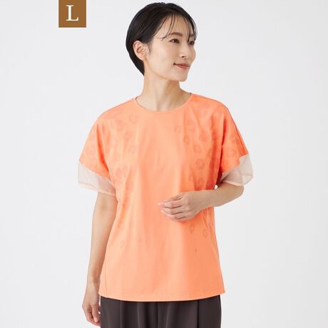 ジャージー素材とソフトオーガンジーを組み合わせた異素材コンビネーションTシャツ。袖は切り替え部分にオーガンジーを使用し、透け感とふんわりしたボリュームでちょうちんのようなシルエットをつくります。前身頃にはパンサーモチーフをさりげない配色でプリント。シンプルながら、スタイリングを印象的に仕上げてくれる一枚です。