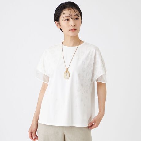 ジャージー素材とソフトオーガンジーを組み合わせた異素材コンビネーションTシャツ。袖は切り替え部分にオーガンジーを使用し、透け感とふんわりしたボリュームでちょうちんのようなシルエットをつくります。前身頃にはパンサーモチーフをさりげない配色でプリント。シンプルながら、スタイリングを印象的に仕上げてくれる一枚です。