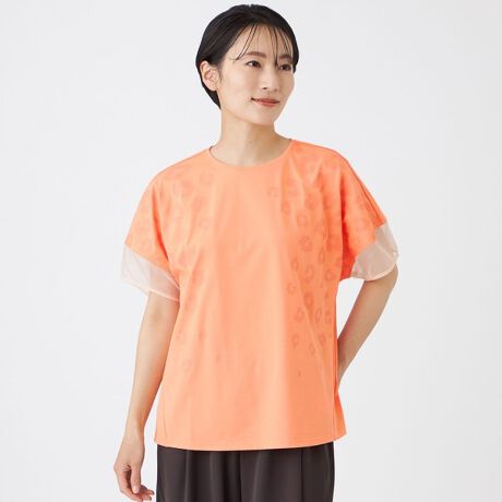ジャージー素材とソフトオーガンジーを組み合わせた異素材コンビネーションTシャツ。袖は切り替え部分にオーガンジーを使用し、透け感とふんわりしたボリュームでちょうちんのようなシルエットをつくります。前身頃にはパンサーモチーフをさりげない配色でプリント。シンプルながら、スタイリングを印象的に仕上げてくれる一枚です。