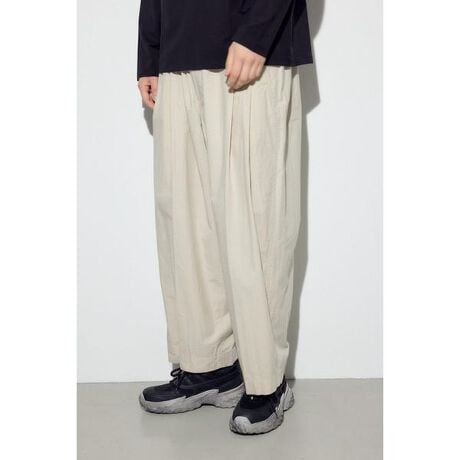 ■パラシュートパンツ■ポイントミリタリー由来のパラシュートパンツをモディファイした一本。コットンポプリンにワッシャー加工を施し、ヴィンテージ感のある表情に仕上げました。自然な風合いと肌離れの良さが魅力で、こなれた印象を演出します。■ディテールフロント両脇に両玉縁ポケットを配置。2タックを入れることで、腰まわりにゆとりを持たせたリラックスシルエットに仕上げています。■スタイリングコーディネートの主役になる存在感のあるパンツ。リラックスしたシルエットながら、ウエストまわりはすっきりと仕上げているため、短丈トップスやタックインスタイルとも好相性。スタイルを選ばず幅広く活躍する、オールラウンドな一本です。■生地ワッシャー加工を施したコットンポプリン素材を使用。透け感:なし裏 地:なし伸縮性:なし光沢感:なし[注意事項]※画像の商品はサンプルです。実際の商品と仕様、加工が若干異なる場合があります。※画像の商品は光の照射や角度、お使いのモニター環境により、実物と色味が異なる場合がございます。※着用、お取り扱いの際は、アテンションタグをご確認ください。