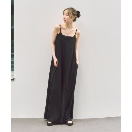 細めのショルダーストラップと裾に向かってゆったりと広がるワイドヘムが印象的なジャンプスーツ。