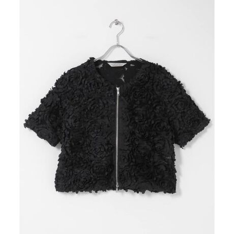 立体感のあるフラワーモチーフが目を惹く、華やかなショートスリーブジャケット。繊細な透け感のある素材に、ふんわりとしたお花の装飾が重なり、上品で女性らしい印象に仕上がっています。コンパクトなシルエットとフロントのジップデザインが甘さを程よく引き締め、カジュアルからきれいめまで幅広いスタイリングにマッチ。デニムと合わせてデイリーに、スカートと合わせて特別なお出かけにもおすすめの一枚です。