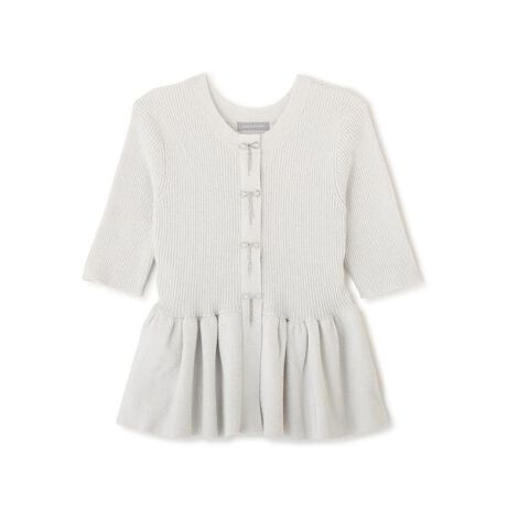 ラメ感のあるモール糸を使用した、華やかな半袖ペプラムニット。ウエストから広がるペプラムシルエットが女性らしさを演出します。ビジュー調リボンがさりげないアクセントになり、フェミニンスタイルにぴったり。スカートはもちろん、デニム合わせも大人可愛いバランスで着られます。※撮影時照明の関係により、色味が違って見える場合がございます。またパソコン・スマートフォンなどの環境により、若干製品と画像のカラーが異なる場合もございます。予めご了承ください。商品の色味は、商品単品画像をご参照下さい。※商品画像はサンプルのため、色味やサイズ等の仕様に変更がある場合がございますので、予めご了承ください。