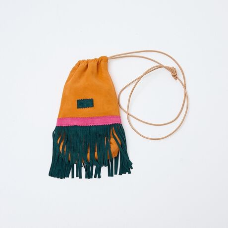柔らかなラムスェードを使用した巾着ショルダー。財布やスマホ、ちょっとした小物を収納できるサイズ感。ショルダーにはナチュラルにカウレザー丸紐を使用しており斜めがけ可能の長さになっています。ゆらゆらっと揺れるフリンジがポイント、裏地付き、内側に小さなポケット2つついています。