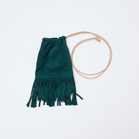 柔らかなラムスェードを使用した巾着ショルダー。財布やスマホ、ちょっとした小物を収納できるサイズ感。ショルダーにはナチュラルにカウレザー丸紐を使用しており斜めがけ可能の長さになっています。ゆらゆらっと揺れるフリンジがポイント、裏地付き、内側に小さなポケット2つついています。