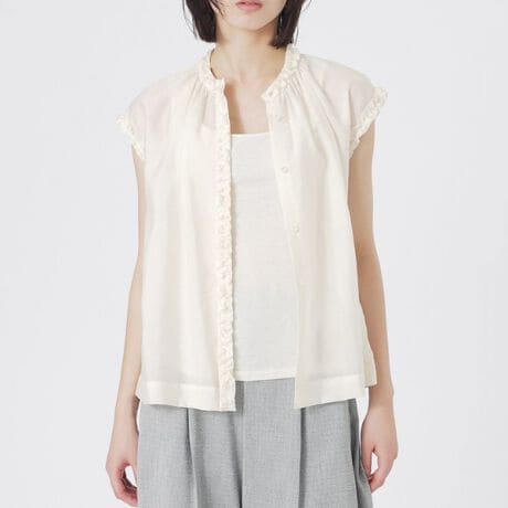 ほど良いハリ感のあるシアー素材に細やかなフリルを施したブラウスです。襟ぐり、袖ぐり、前立てに細かなフリルを入れることで、素材感と相まって繊細で優しい表情のブラウスに仕上がっています。