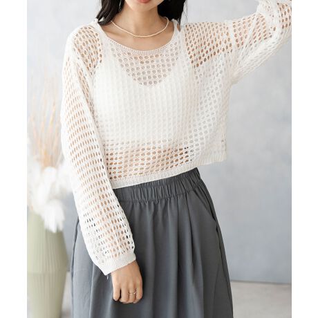インナー付き透かし編み長袖ショート丈シアーカギ編みニットトップス