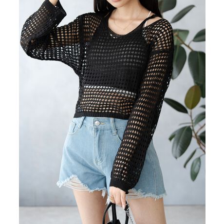 インナー付き透かし編み長袖ショート丈シアーカギ編みニットトップス