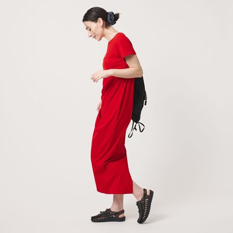 縦のラインですっきり見せる、ミニマルなカットソーワンピース