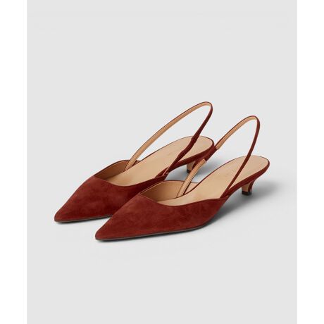 こっくりとしたスエードのダークブラウンとブラウンレッドが新登場。長めのノーズでフェミニンになり過ぎないよう、エッジィさを残したポインテッドトゥのバックストラップパンプス。足を綺麗に見せるポイントになる、履き口のラインにこだわり、1mm単位の修正をなんども重ねて仕上がりました。スクエアぎみのすっきりした美くしい履き口のシルエットとバックストラップが大人の女性らしさを引き出してくれます。ソックスとのコーディネートも可愛く履いて頂けます。