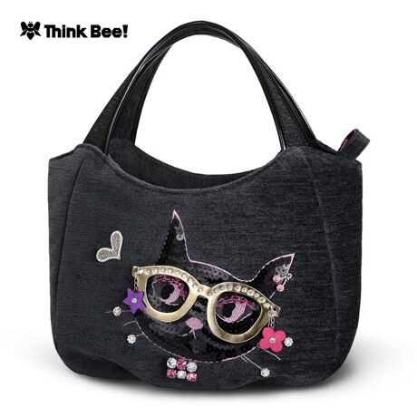 ほんのり光沢のある柔らかな生地に、黒ネコの顔を大胆に刺繍した個性的な作品。