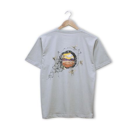 左胸に囚人番号である「27」をひび割れプリント。 背中には牢屋の壁の穴が、蜂とともに描かれています。外の風景をあえて派手に色付けすることにより 「牢屋」という外界から閉ざされた空間を表現しています。