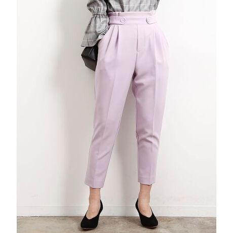 フロントベルトのボタンがアクセントになったタックテーパードパンツ。