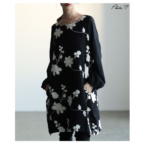 ブラックベースにホワイトの花が咲き散るワンピースです。