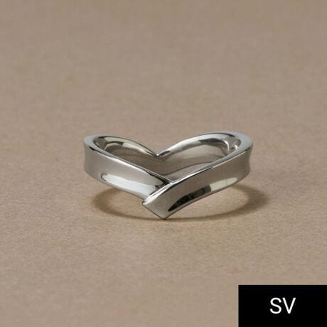鈍いシルバーな感じです。見た目がハートぽくなりそうで購入しましたが、実際はそのままのブイカットにしか見えず、少し残念です。中指にさしているのでボリューム感はちょうどよいです。